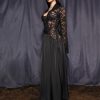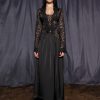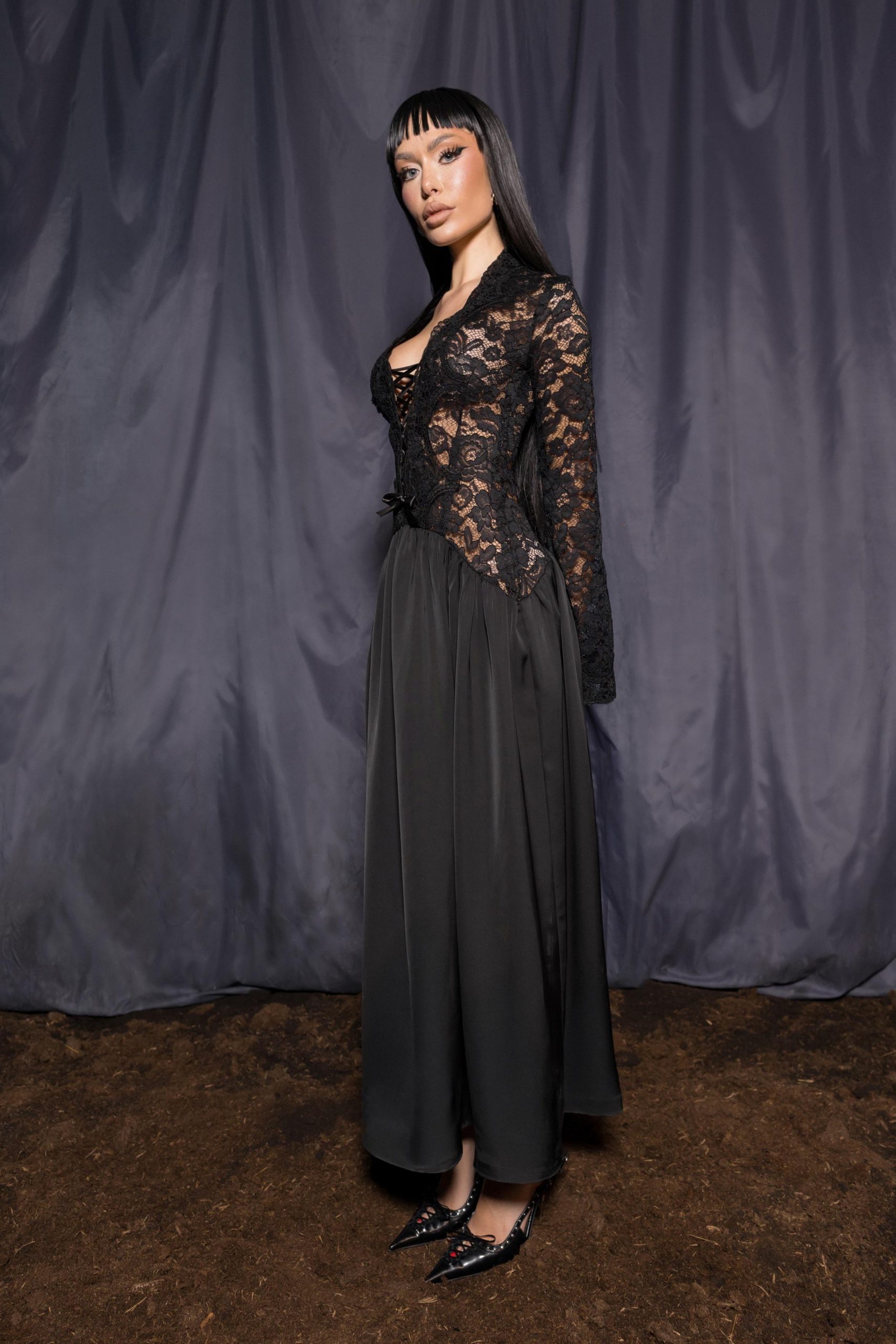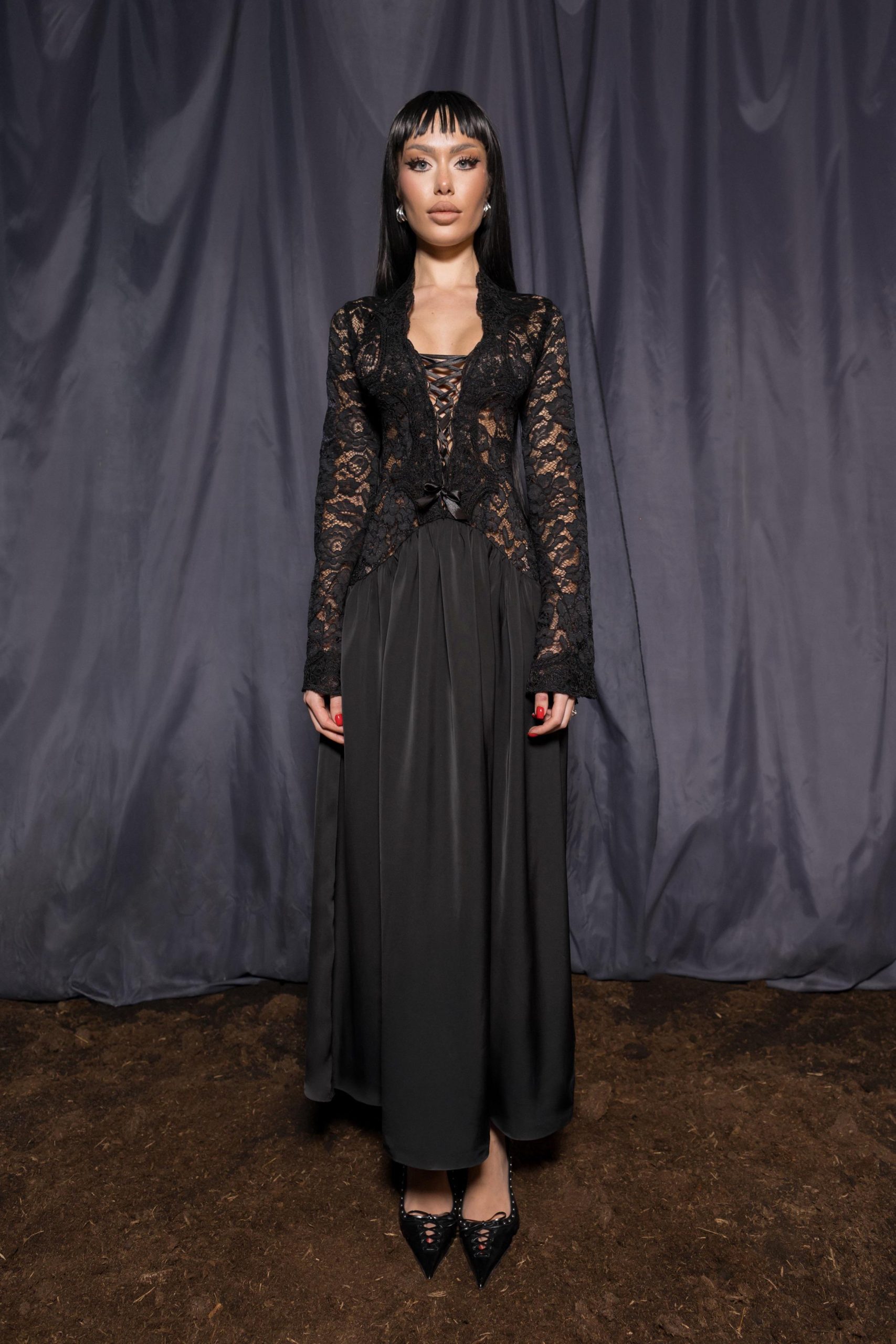 Crafted from macramé lace and satin, featuring a fitted bodice with lace-up detailing and a soft flared skirt. Designed to contour the body while keeping a fluid silhouette.