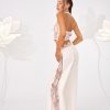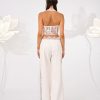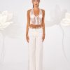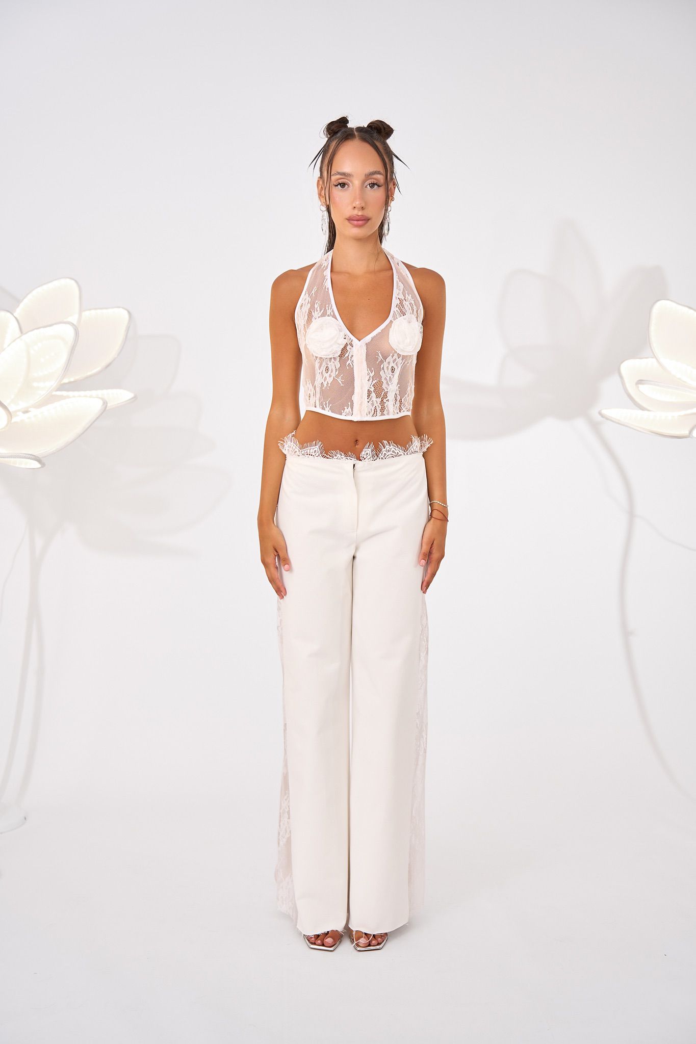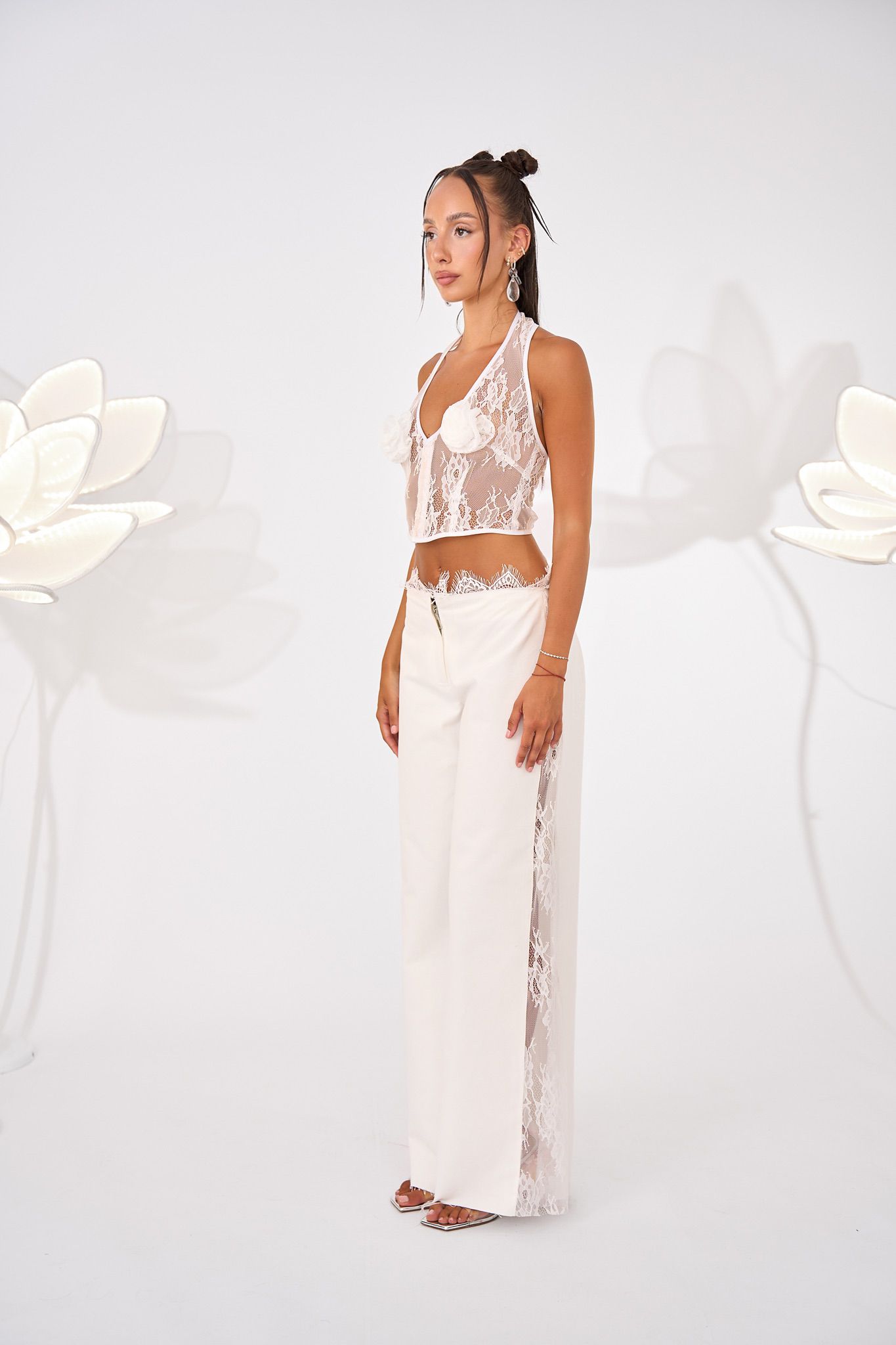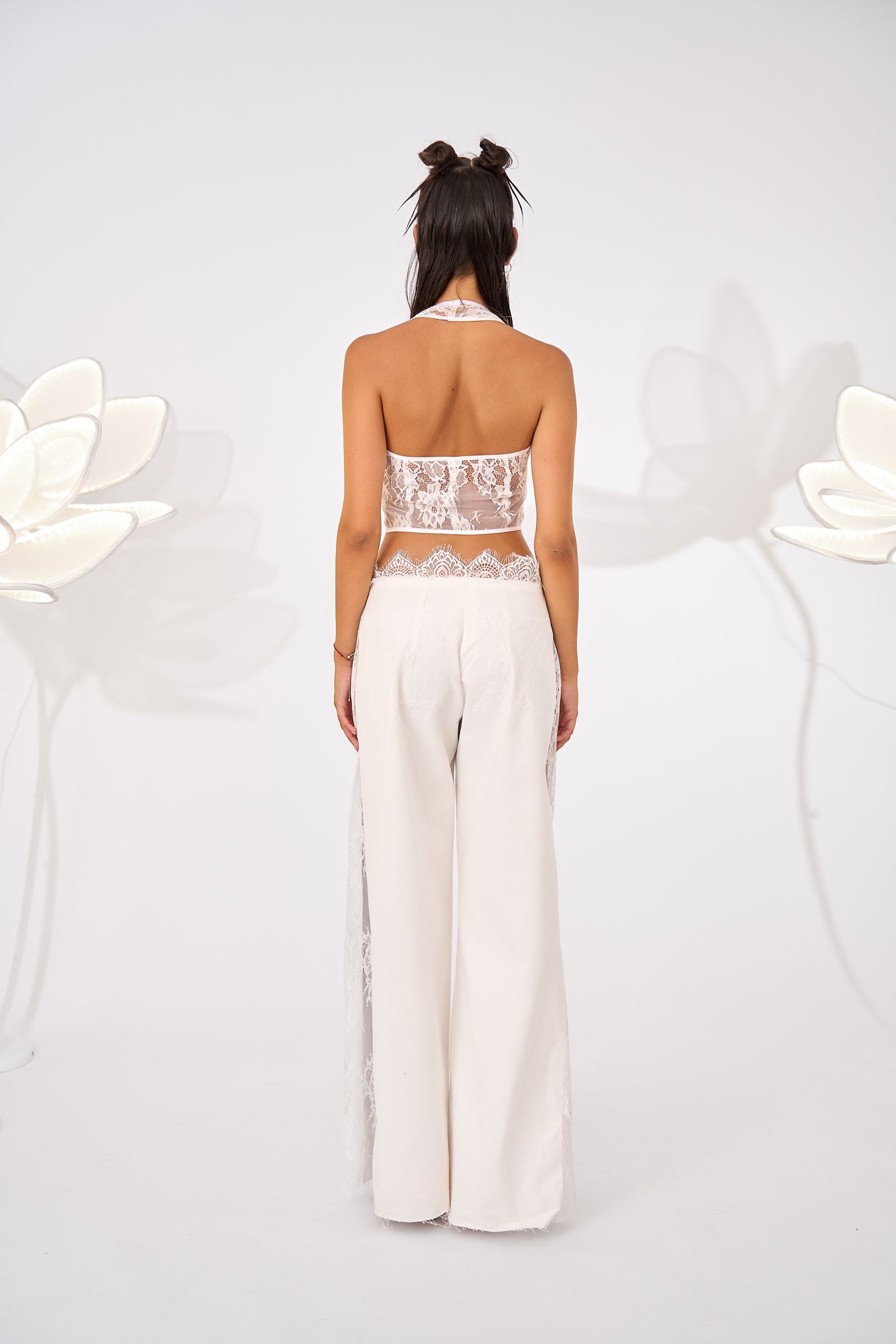Low-waisted, denim trousers with a clean front and soft tailoring. The waistband is accented with lace trim peeking above the waistline.